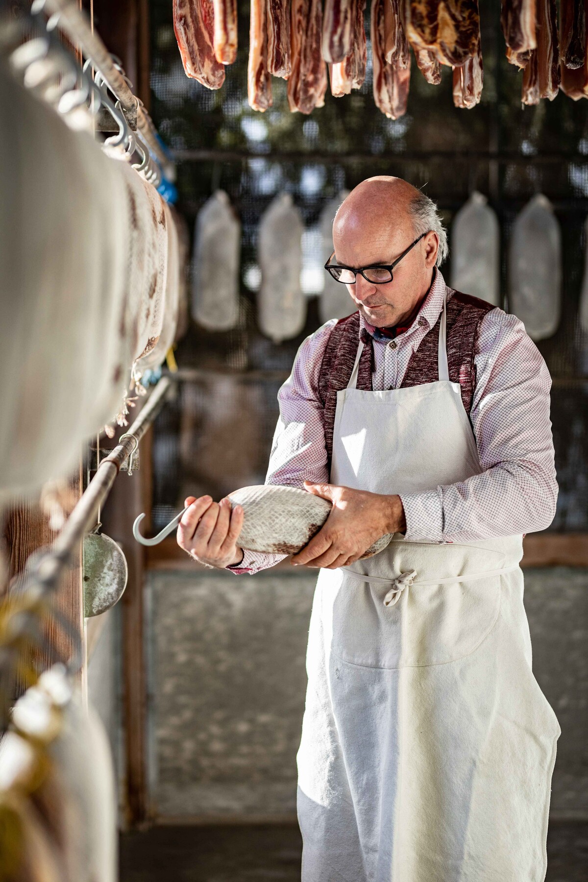 Die Türe öffnet sich. Dahinter erscheint ein grossgewachsener Mann in rotkariertem Hemd, eine Lederschürze um die Hüfte gebunden, mit einladendem Lächeln im Gesicht. «Willkommen in unserer Fleischmanufaktur», begrüsst uns Jörg Brügger. Vor uns steht einer der letzten seiner Art. Zumindest was sein Handwerk betrifft. Brügger ist traditioneller Fleischtrockner. Seine Spezialität: Bündnerfleisch.