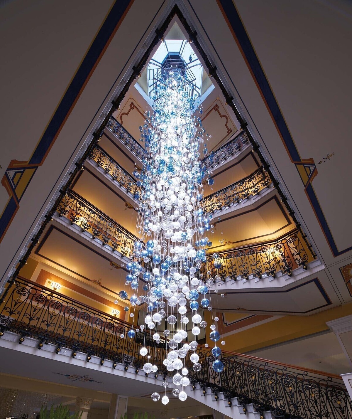 Der erste Blick beim Betreten des Grand Hotel Quellenhof fällt unwillkürlich auf die Lobby mit ihrem besonderen Augenmerk: dem 18 Meter hohen Kronleuchter. Er erstreckt sich über vier Etagen und erweckt mit rund 2'400 mundgeblasenen Kugeln die Vorstellung eines Wasserfalls. Wussten Sie, dass die Kugeln von Hand abgestaubt werden? Zweimal im Jahr seilen sich zwei mutige Techniker von der Dachkonstruktion ab, um jede Kugel zu säubern, zu prüfen und neu auszurichten.
