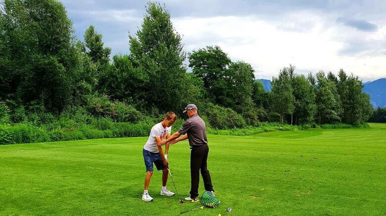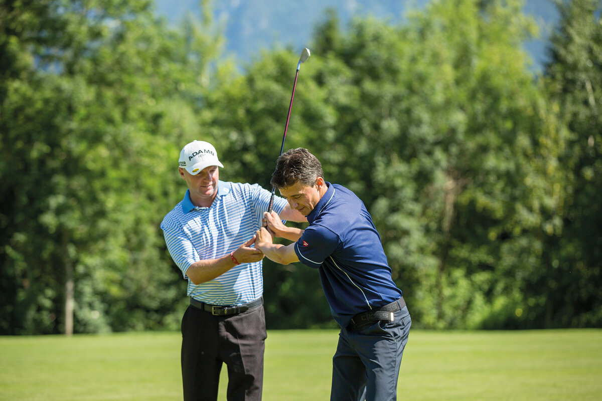 «Na dann, let's go.» Let's go. Wenn's doch nur so einfach wäre. Ich komme mir vor wie in meinen ersten Minuten am Steuer eines Autos. Die Anweisungen klingen ganz easy. Doch kaum legst du los, rattert der Motor und stirbt nach ein paar Sekunden ab. Hüftbreit stehen, Ball in der Mitte, leicht in die Knie, mit dem Oberkörper nach vorne, die Schultern locker halten, Arme strecken. Bis knapp zur Hüfte ausholen – und dann voll durchschwingen. Beim ersten Versuch schlage ich voll in den Boden. Statt Ball fliegt Rasen.
