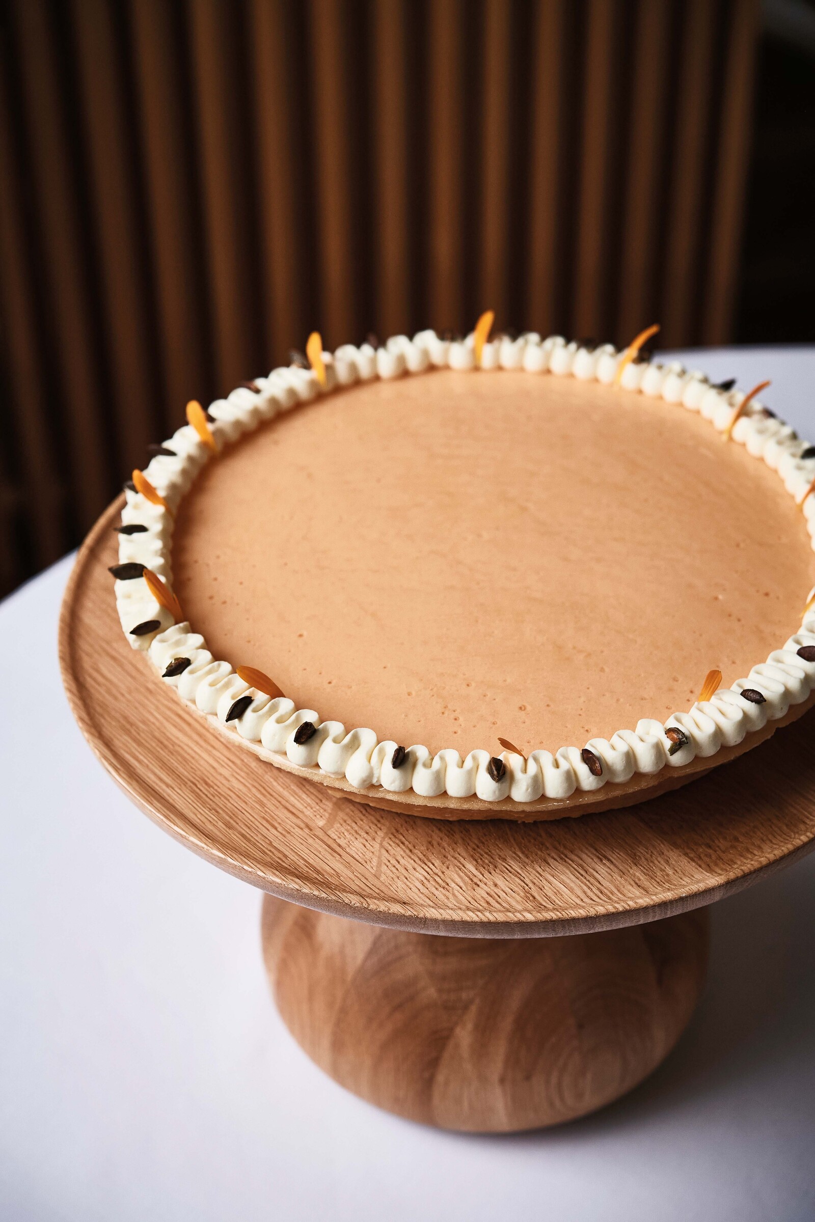 Einen Muskatkürbis (ca. 600 bis 700 Gramm) bei 180 Grad im Ofen garen bis er komplett weich ist. Den Kürbis von Kernen und Schale befreien und in einem Mixer zu feinem Püree mixen. Das Püree über einem Sieb abtropfen lassen. Eine Tarteform mit Mürbeteig auslegen und im Ofen blind backen (ohne Füllung). Nach dem Erkalten dünn mit flüssiger weisser Schokolade ausstreichen.