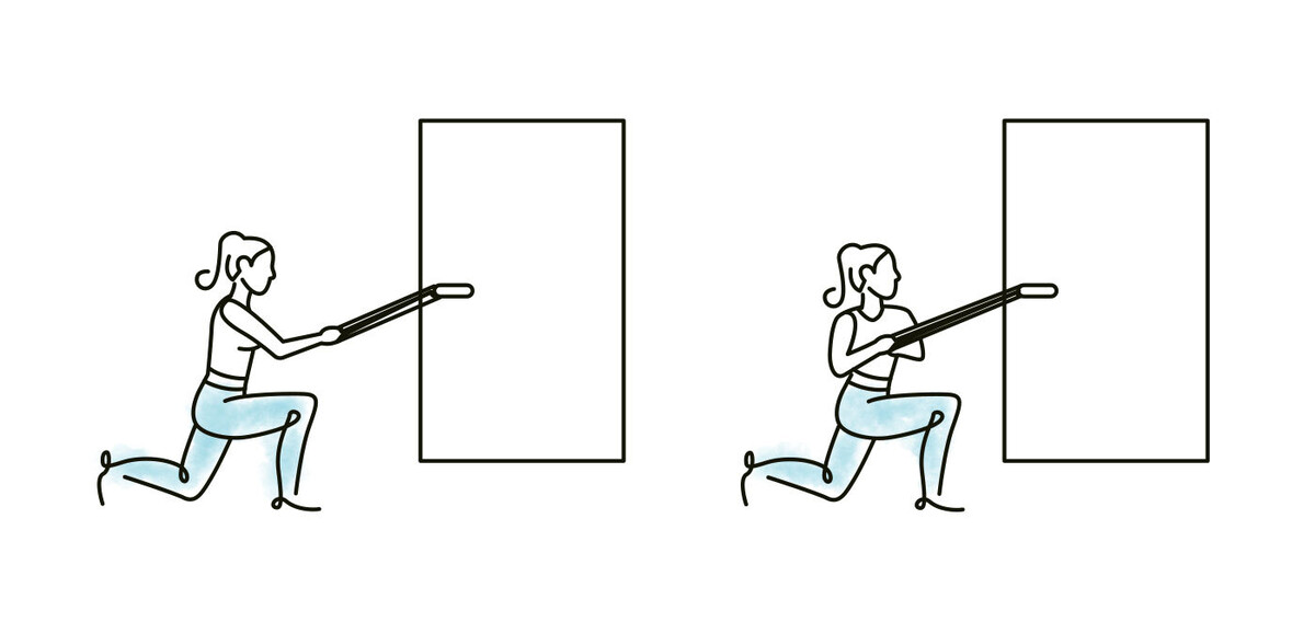 Ausfallschritt nach vorne, dabei bleiben Fuss, Knie und Hüfte in einer geraden Linie und der Rumpf aufrecht und stabil. Brustkorb über das vorgestellte Bein seitlich von der Tür wegdrehen. Brustkorb zurückdrehen und wieder in die Ausgangsstellung zurückkehren.