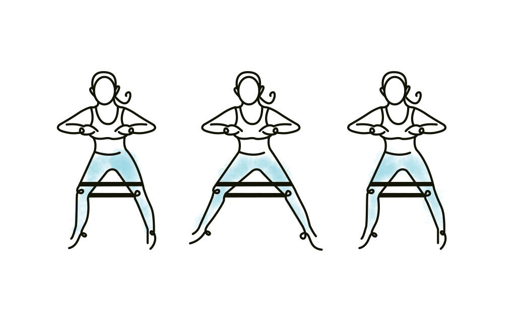 Theraband über den Knien befestigen, schulterbreiter Stand, Knie so weit nach aussen drehen, dass die Kniescheiben über die kleinen Zehen schauen, in die Kniebeuge gehen