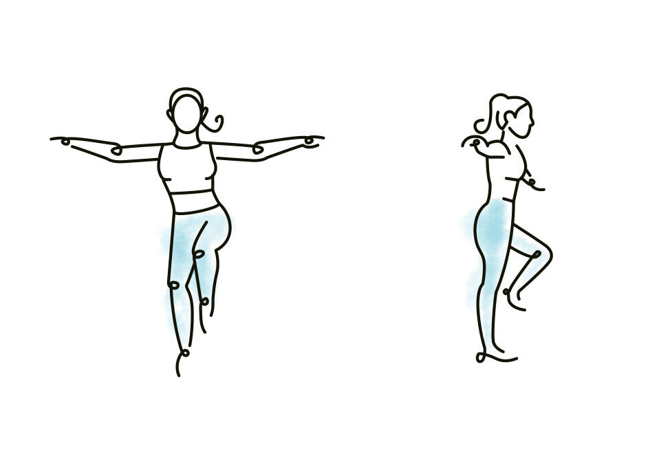 Einbeiniger Stand, anderes Bein angezogen, Arme seitlich ausgestreckt