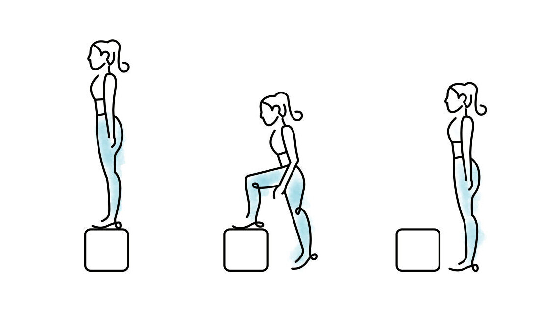 Mit dem rechten Bein die Stufe hochsteigen und mit dem linken wieder runter.