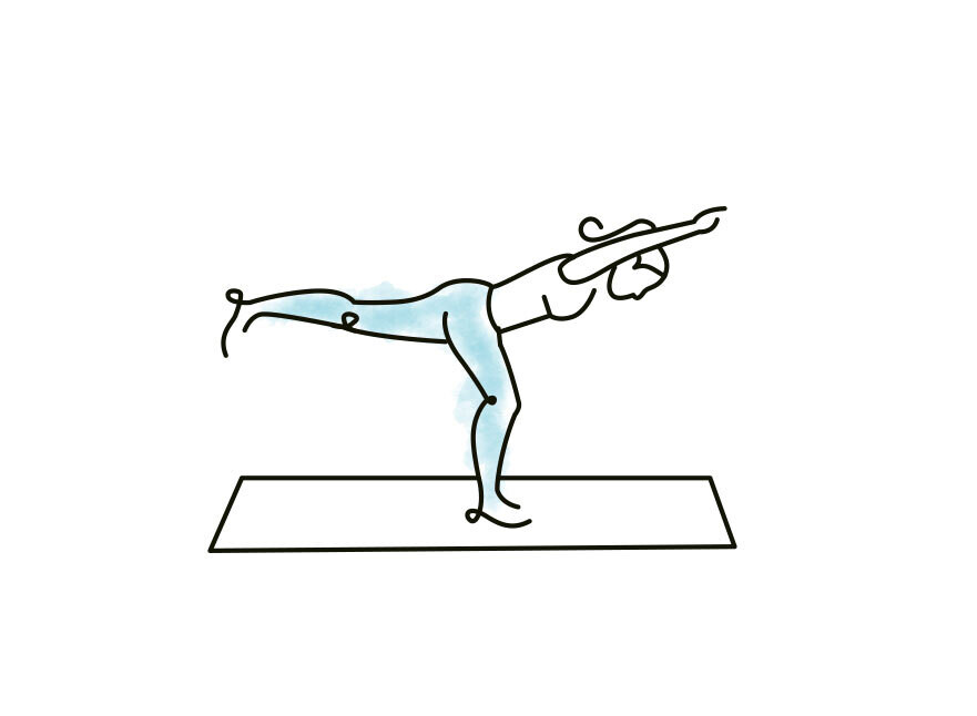 Oberkörper nach vorn beugen und das rechte Bein fast ganz durchgestreckt anheben (90 Grad Winkel